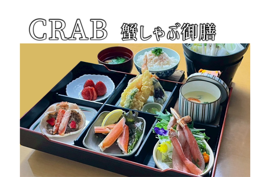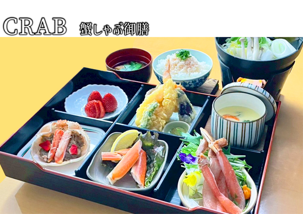 ・ズワイガニの蟹しゃぶ・茹でズワイガニ・ズワイガニの甲羅みそ焼き・カニ身入り茶碗蒸し・天ぷら(海老/獅子唐/茄子/薩摩芋)