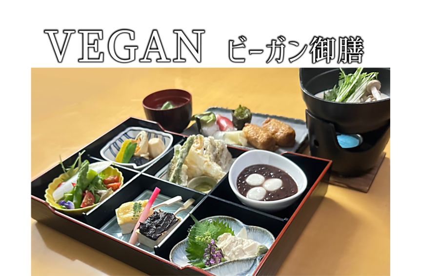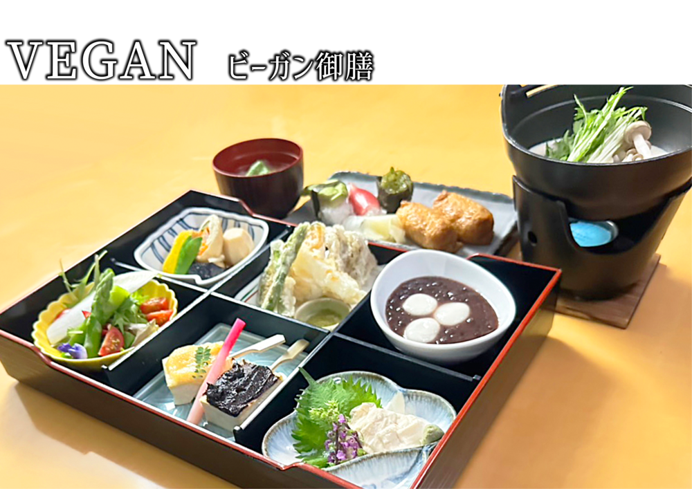 ・生湯葉刺身・豆腐田楽焼き・サラダ・白玉ぜんざい・野菜の天ぷら・信田巻きと野菜の煮物・豆乳鍋・いなり寿司と野菜寿司・野菜の味噌汁